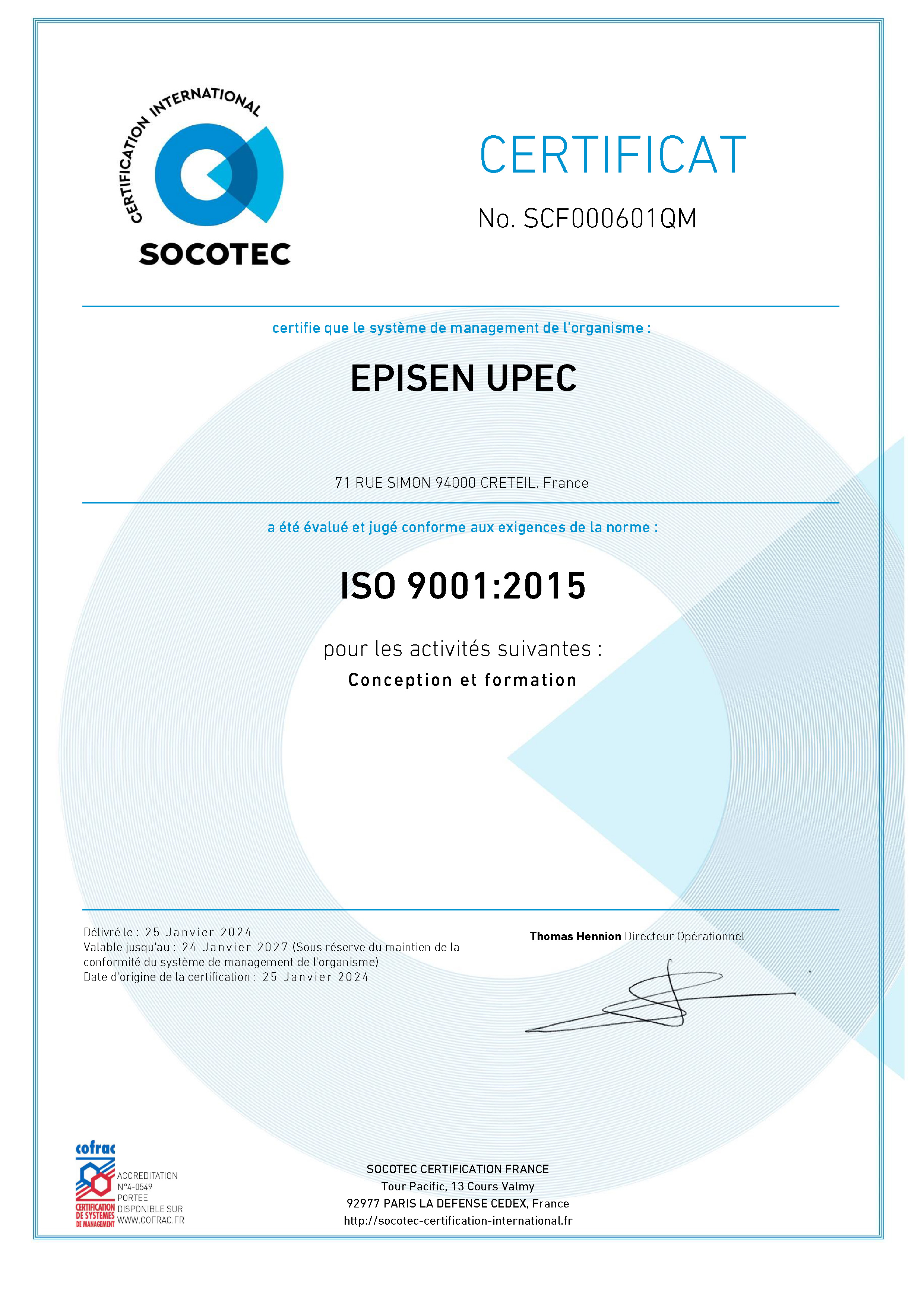La certification ISO 9001 constitue une étape essentielle de l’évolution actuelle et future de l’EPISEN. La certification est valable pour une durée de trois ans et doit être maintenue chaque année au moyen d’un audit de surveillance.